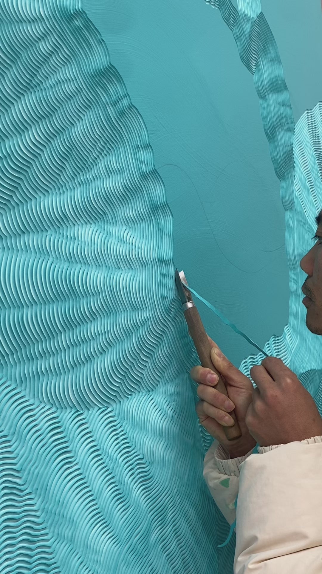 Layer upon layer of dense acrylic is built up, then hand-carved with sculpting blades, allowing color and rhythm to emerge through relief.